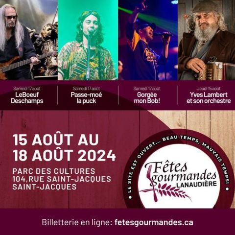 présenté par Promutuel Lanaudière. Le samedi, dès l'après-midi, profitez de l’excellent spectacle LeBœuf Deschamps, spécial Offenbach, suivi à 20h d’un hommage aux Colocs. La soirée se prolongera avec un spectacle en formule «after party» hommage à Bob Bissonnette, présenté par Impack. Enfin, le dimanche 20 août, nous clôturerons en beauté avec un spectacle des Cousins Branchaud, présenté par CFNJ, pour terminer ce week-end festif et gourmand.