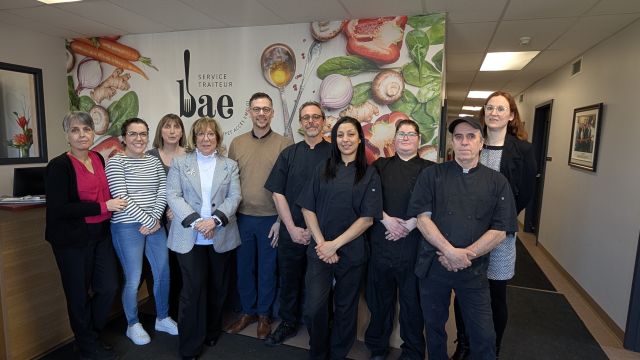 Une partie de l’équipe, de gauche à droite : Marie-Claude Damour, Nacha Brunelle, Isabelle Côté, Lynda Paul, Joël Labelle, Gaël Fourrier, Chahimez Amiri, Mary-Ève Pagé, Jean-Yves Gagnon et Maude Boulianne.Aujourd’hui il relève le défi du Buffet Accès Emploi, qui offre en parallèle de son parcours d’insertion, un service traiteur… avec ou sans serveurrs(ses), pour entreprises, mariages, soirées, etc., donjc il y a une portion vente, parmi ses services il y a aussi les repas préparés et les cantines de plusieurs écoles de la région.