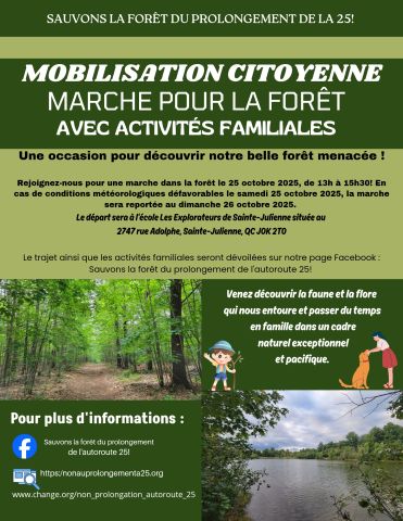 Le groupe Sauvons la forêt du prolongement de l’autoroute 25 convie la population à une grande marche citoyenne le samedi 25 octobre 2025, de 13h à 15h30, afin de sensibiliser la communauté aux impacts environnementaux du projet de prolongement de l’autoroute 25 et de réaffirmer l’importance de préserver ce milieu naturel unique.